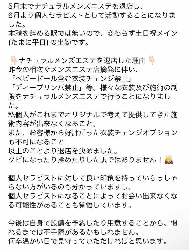 在籍していたナチュラルメンズエステ店を5月末で退店し、6月から個人セラピストとして活動することとなりました。ナチュラルは摘発を恐れてベビードール含む衣装チェンジ禁止、ディープリンパ禁止等、様々な衣装及び施術の制限を行うことになりました。