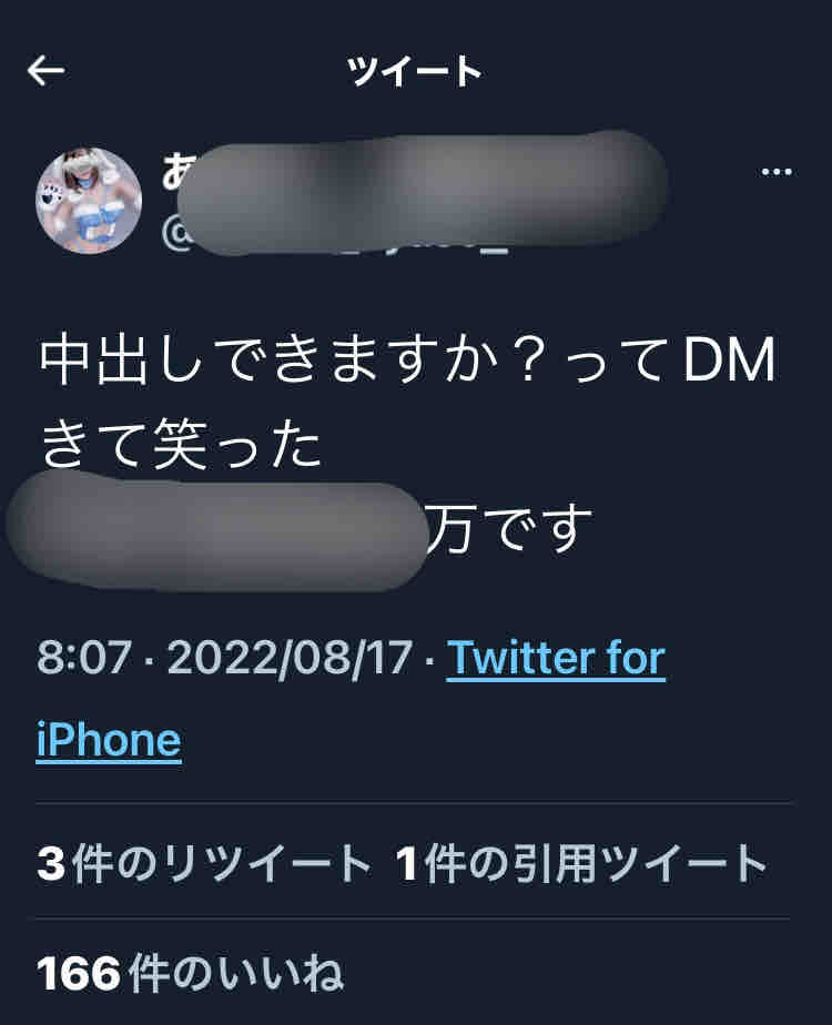 アップしている画像もド健全なものばかりなので、なぜ「中出しできますか?」DMを送ったのか、全く理解出来ませんでした。