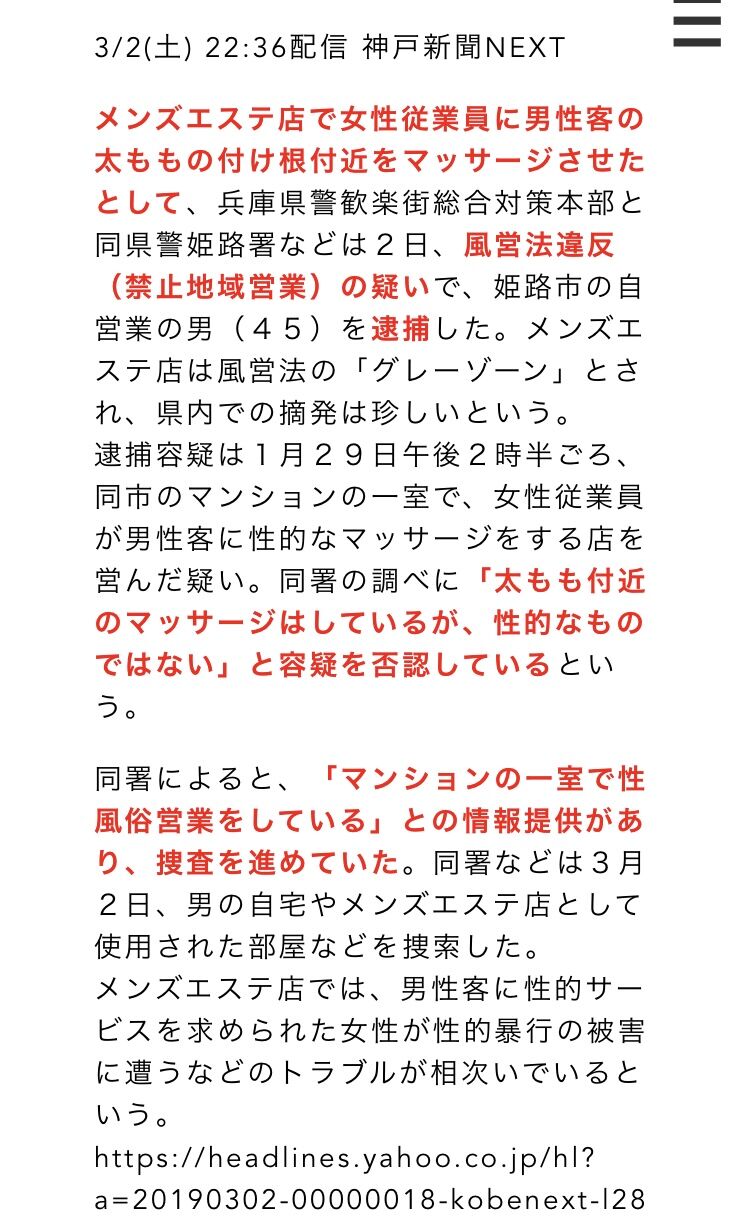 過去に、「太ももの付け根付近をマッサージ」させたとして経営者が逮捕された事例もあります。