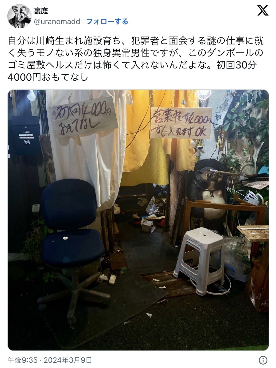 自分は川崎生まれ施設育ち、犯罪者と面会する謎の仕事に就く失うモノない系の独身異常男性ですが、このダンボールのゴミ屋敷ヘルスだけは怖くて入れないんだよな。初回30分4000円おもてなし pic.twitter.com/mnesUaryjv